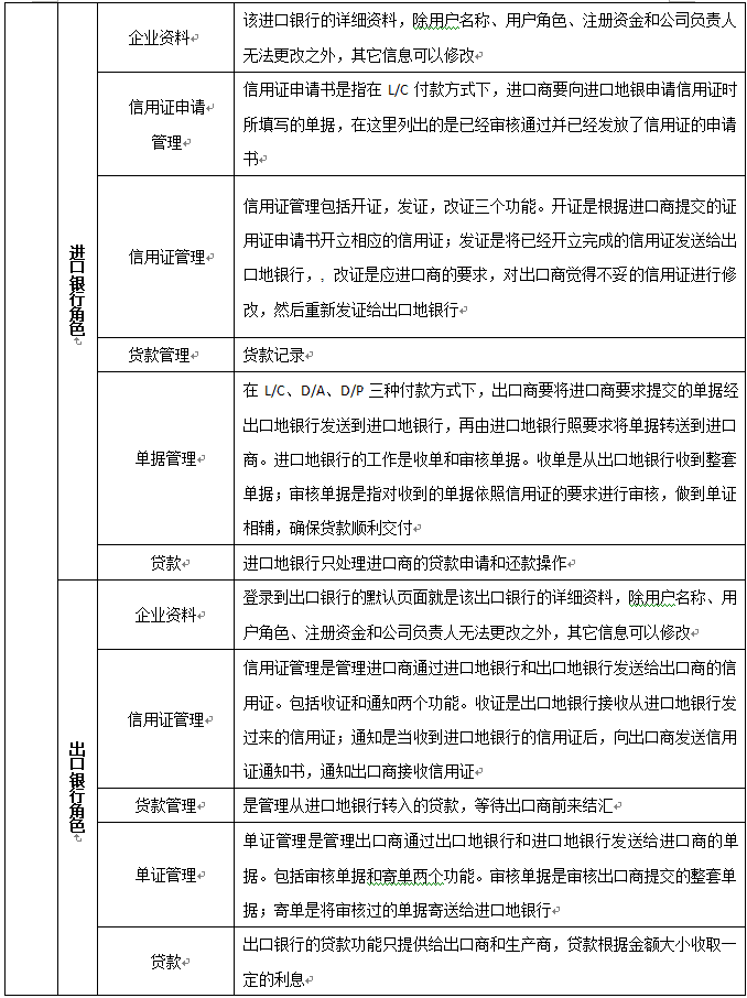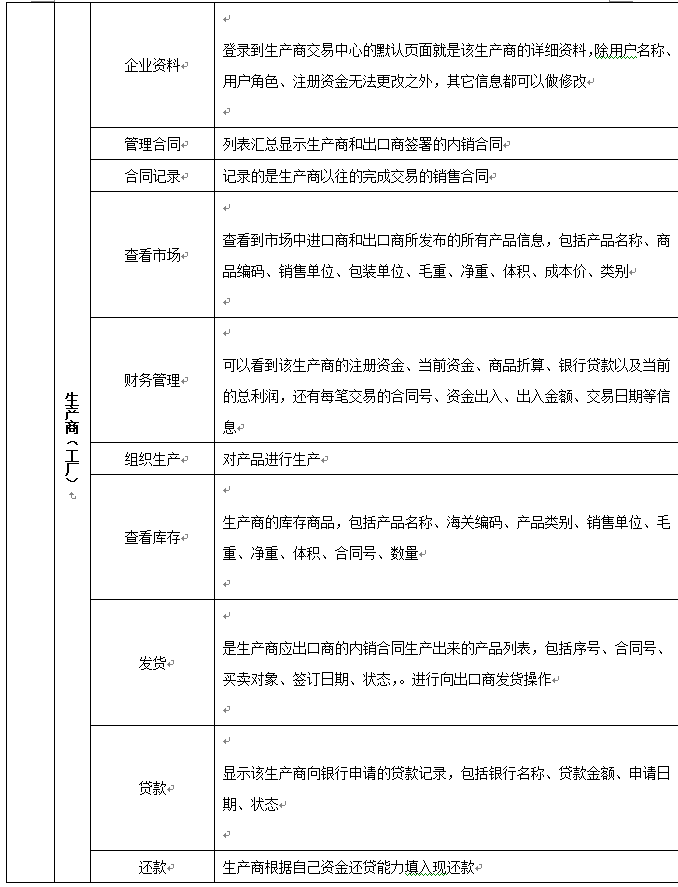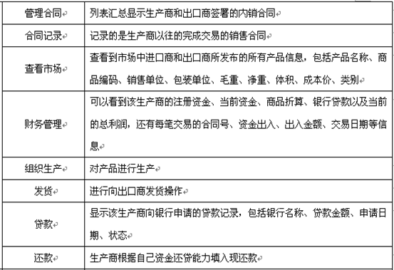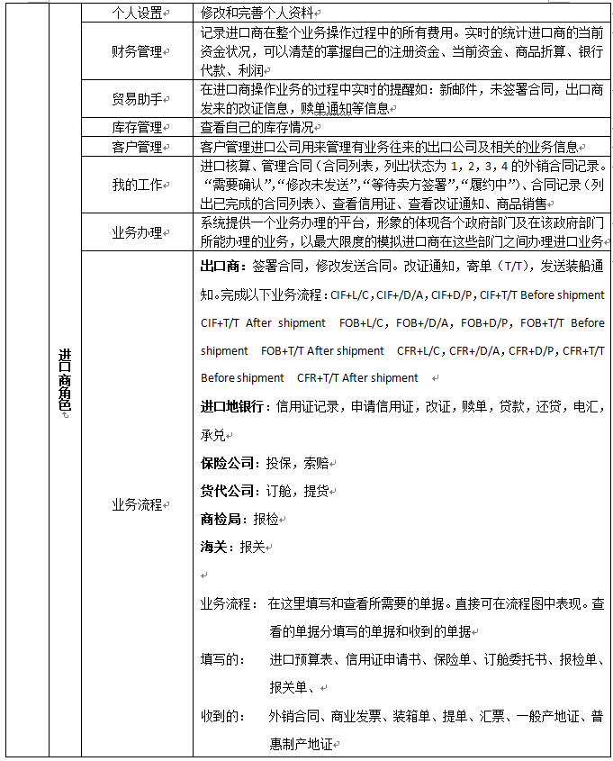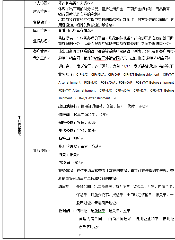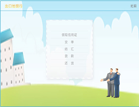7、可(ke)以配置進(jin)口(kou)(kou)商(shang)(shang)、出口(kou)(kou)商(shang)(shang)、進(jin)口(kou)(kou)地銀行(xing)、出口(kou)(kou)地銀行(xing)、國(guo)稅局(ju)、海關、商(shang)(shang)檢局(ju)、保險(xian)公(gong)司、貨代(dai)公(gong)司、外匯管(guan)理局(ju)等相關參(can)數和業務,在實(shi)訓(xun)過程(cheng)中可(ke)以分組、分角(jiao)色(se)進(jin)行(xing)互(hu)動、交互(hu)式訓(xun)練。角(jiao)色(se)扮演:出口(kou)(kou)商(shang)(shang)、進(jin)口(kou)(kou)商(shang)(shang)、生產商(shang)(shang)(工廠)、進(jin)口(kou)(kou)銀行(xing)、出口(kou)(kou)銀行(xing)、保險(xian)公(gong)司、商(shang)(shang)檢局(ju)、海關、外匯管(guan)理局(ju)、貨代(dai)、國(guo)稅局(ju)