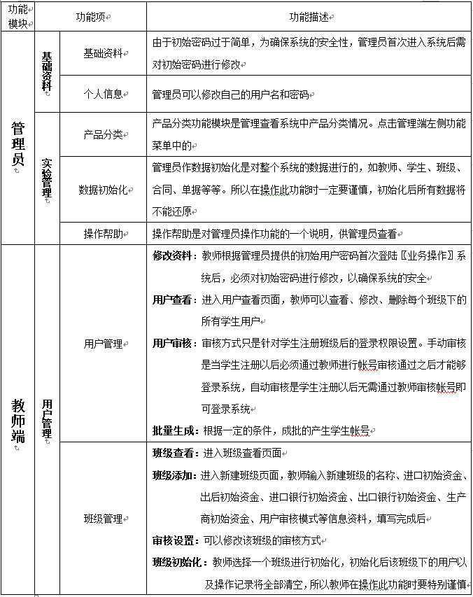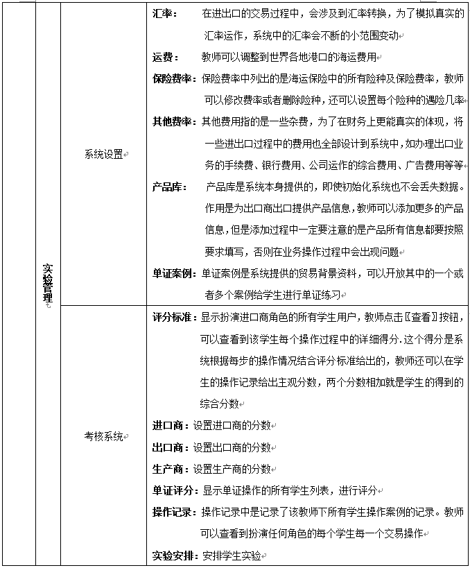 8、教(jiao)師為參加實習(xi)的(de)學生(sheng)分(fen)配角色(se),設定實習(xi)評(ping)分(fen)標準、實時監控學生(sheng)的(de)操作,并(bing)且對于模擬貿(mao)易(yi)中(zhong)發(fa)生(sheng)的(de)糾紛進行仲(zhong)裁,最終利用評(ping)分(fen)系統對學生(sheng)的(de)實習(xi)成果給(gei)予評(ping)定,教(jiao)師通過(guo)在(zai)網站發(fa)布新(xin)聞、調(diao)整商品(pin)成本和價格、調(diao)整匯(hui)率(lv)、業務費用、海運費、保險(xian)費率(lv)及突發(fa)事件的(de)發(fa)生(sheng)概率(lv)等方式對國際貿(mao)易(yi)環境實施(shi)宏觀(guan)調(diao)控,讓學生(sheng)在(zai)實習(xi)中(zhong)充分(fen)發(fa)揮主觀(guan)能動性