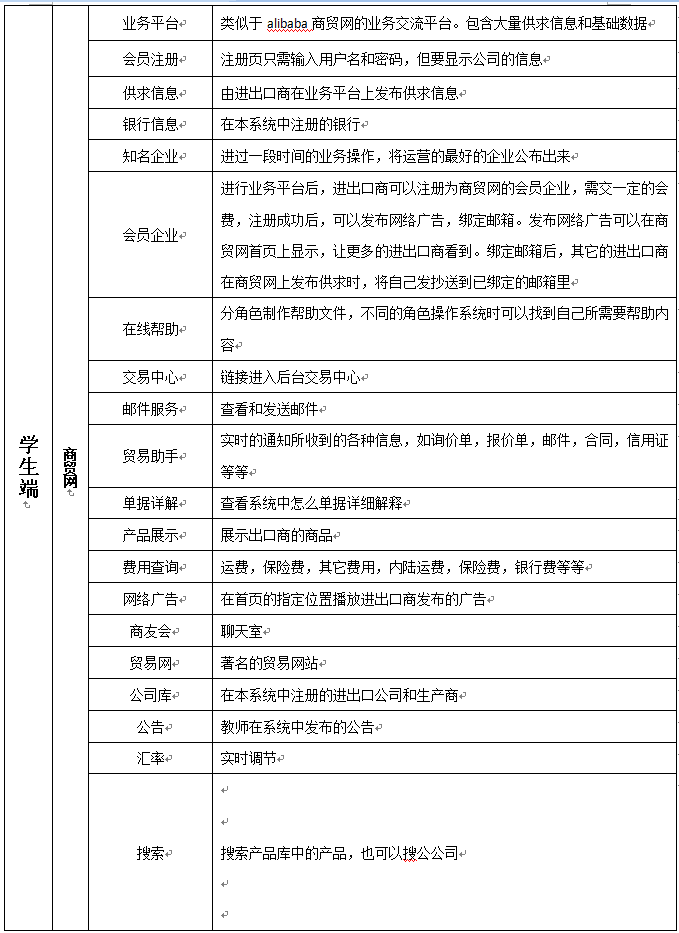 類似于(yu)alibaba商(shang)貿(mao)網的業(ye)務交(jiao)流平(ping)臺(tai)。包含(han)大(da)量供求(qiu)信息和基礎數據(ju) ,進口(kou)商(shang)與(yu)出口(kou)商(shang)在平(ping)臺(tai)發生交(jiao)互,能很快地熟練運用進出口(kou)的成(cheng)本核算(suan)、詢盤、報盤、還盤等各種(zhong)基本技巧。 3、國(guo)際貿(mao)易與(yu)角色扮(ban)演: