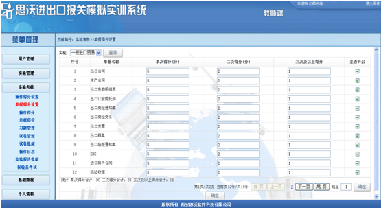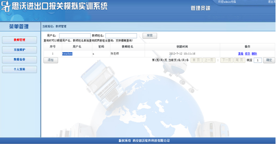 5、軟件分為(wei)管(guan)理(li)員(yuan)、教(jiao)師、學生(sheng)三種用戶(hu)權限,管(guan)理(li)員(yuan)端(duan)主(zhu)(zhu)要功能是設置(zhi)(zhi)教(jiao)師用戶(hu)以及(ji)(ji)數據(ju)的維護(hu)。教(jiao)師端(duan)主(zhu)(zhu)要負責(ze)管(guan)理(li)學生(sheng)用戶(hu)信(xin)息、設置(zhi)(zhi)學生(sheng)實(shi)驗任(ren)務、維護(hu)實(shi)驗基(ji)礎數據(ju)、對學生(sheng)實(shi)驗情況進行考(kao)核。學生(sheng)端(duan)根據(ju)布(bu)置(zhi)(zhi)的實(shi)驗任(ren)務,完成實(shi)驗任(ren)務,熟悉報關(guan)(guan)(guan)相關(guan)(guan)(guan)規范、掌握(wo)報關(guan)(guan)(guan)業務流程(cheng)以及(ji)(ji)單據(ju)的填制(zhi)。