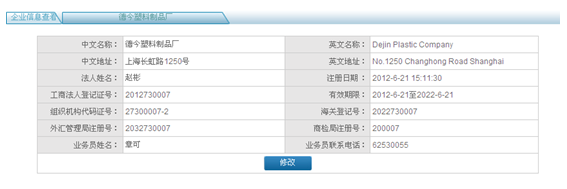 企業信息中(zhong)工商法人登記(ji)證(zheng)(zheng)號(hao)(hao)、組織機構(gou)代碼證(zheng)(zheng)號(hao)(hao)、外匯管理局注冊號(hao)(hao)、有效(xiao)期限、海關登記(ji)號(hao)(hao)和商檢局注冊號(hao)(hao)在企業注冊完成后自(zi)動生(sheng)成。