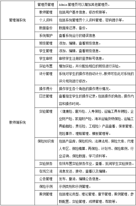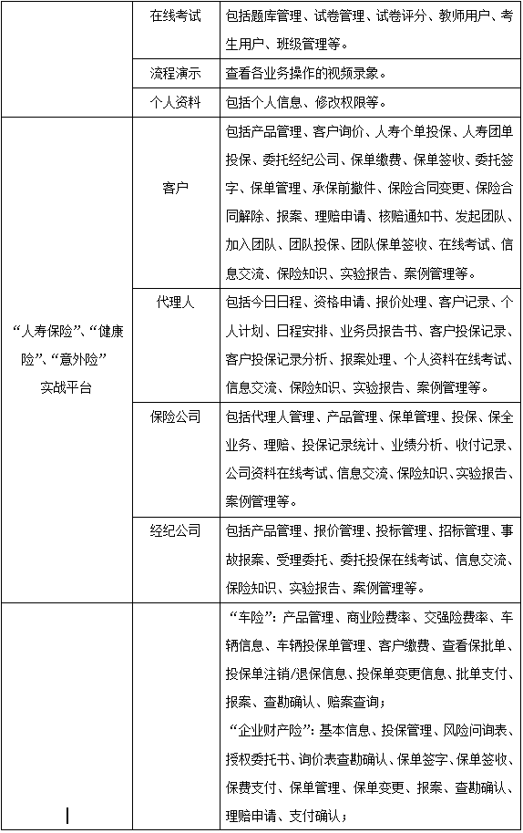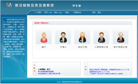 學(xue)生(sheng)通過飾演保(bao)(bao)(bao)險(xian)(xian)(xian)(xian)(xian)(xian)業(ye)(ye)務流程中的(de)客戶、代理(li)人、經紀公(gong)司、人壽(shou)保(bao)(bao)(bao)險(xian)(xian)(xian)(xian)(xian)(xian)公(gong)司、財產保(bao)(bao)(bao)險(xian)(xian)(xian)(xian)(xian)(xian)公(gong)司五種(zhong)角(jiao)色(se),進入“人壽(shou)保(bao)(bao)(bao)險(xian)(xian)(xian)(xian)(xian)(xian)”和“財產保(bao)(bao)(bao)險(xian)(xian)(xian)(xian)(xian)(xian)”實踐平臺,從展業(ye)(ye)投保(bao)(bao)(bao)環節開始(shi),至索賠理(li)賠為止,全面操(cao)練保(bao)(bao)(bao)險(xian)(xian)(xian)(xian)(xian)(xian)核(he)心業(ye)(ye)務中的(de)投保(bao)(bao)(bao)、承(cheng)保(bao)(bao)(bao)、核(he)保(bao)(bao)(bao)、變更、理(li)賠、核(he)賠等流程,使學(xue)生(sheng)的(de)知識結構提升,彌補實踐業(ye)(ye)務操(cao)作(zuo)的(de)缺乏,實現對人壽(shou)保(bao)(bao)(bao)險(xian)(xian)(xian)(xian)(xian)(xian)、運輸(shu)(shu)工(gong)具車輛險(xian)(xian)(xian)(xian)(xian)(xian)、企業(ye)(ye)財產險(xian)(xian)(xian)(xian)(xian)(xian)、家庭財產險(xian)(xian)(xian)(xian)(xian)(xian)、海洋運輸(shu)(shu)貨物(wu)保(bao)(bao)(bao)險(xian)(xian)(xian)(xian)(xian)(xian)、運輸(shu)(shu)工(gong)具船舶險(xian)(xian)(xian)(xian)(xian)(xian)、責任險(xian)(xian)(xian)(xian)(xian)(xian)、工(gong)程險(xian)(xian)(xian)(xian)(xian)(xian)的(de)熟悉(xi)、掌握(wo),對保(bao)(bao)(bao)險(xian)(xian)(xian)(xian)(xian)(xian)業(ye)(ye)務的(de)主要工(gong)作(zuo)流程有一(yi)個清晰的(de)輪廓,為學(xue)以致用打下堅固的(de)基礎。