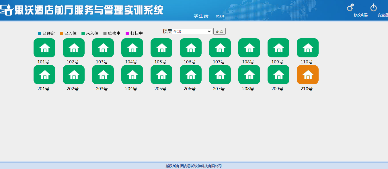思沃酒(jiu)店前(qian)廳服務(wu)與管(guan)理(li)模(mo)擬實(shi)訓(xun)平(ping)臺系統以學生(sheng)酒(jiu)店前(qian)廳工作崗位任務(wu)為基礎,以案(an)例動畫(hua)結合(he)的(de)(de)(de)(de)模(mo)式(shi)開展(zhan)情景模(mo)擬實(shi)訓(xun),學生(sheng)可在該(gai)教(jiao)學軟件設置的(de)(de)(de)(de)虛擬酒(jiu)店環(huan)境(jing)中,完成預(yu)定、入住辦理(li)、續住、退房、換(huan)房、會(hui)員管(guan)理(li)、故障報修、投(tou)訴(su)處理(li)、黑名單(dan)等相關案(an)例任務(wu)的(de)(de)(de)(de)操作。該(gai)教(jiao)學平(ping)臺軟件可以逼(bi)真(zhen)的(de)(de)(de)(de)體驗實(shi)際酒(jiu)店前(qian)廳工作的(de)(de)(de)(de)過(guo)程。本公司為了(le)更(geng)好滿足高校的(de)(de)(de)(de)教(jiao)學需求(qiu)(qiu),也會(hui)根據高校的(de)(de)(de)(de)需求(qiu)(qiu)提(ti)供酒(jiu)店管(guan)理(li)實(shi)訓(xun)室(shi)解(jie)決方案(an),