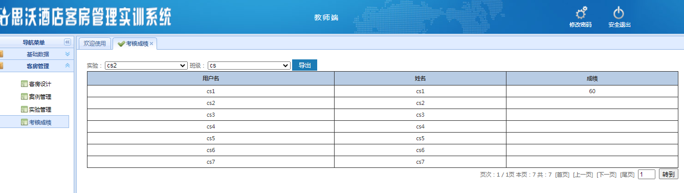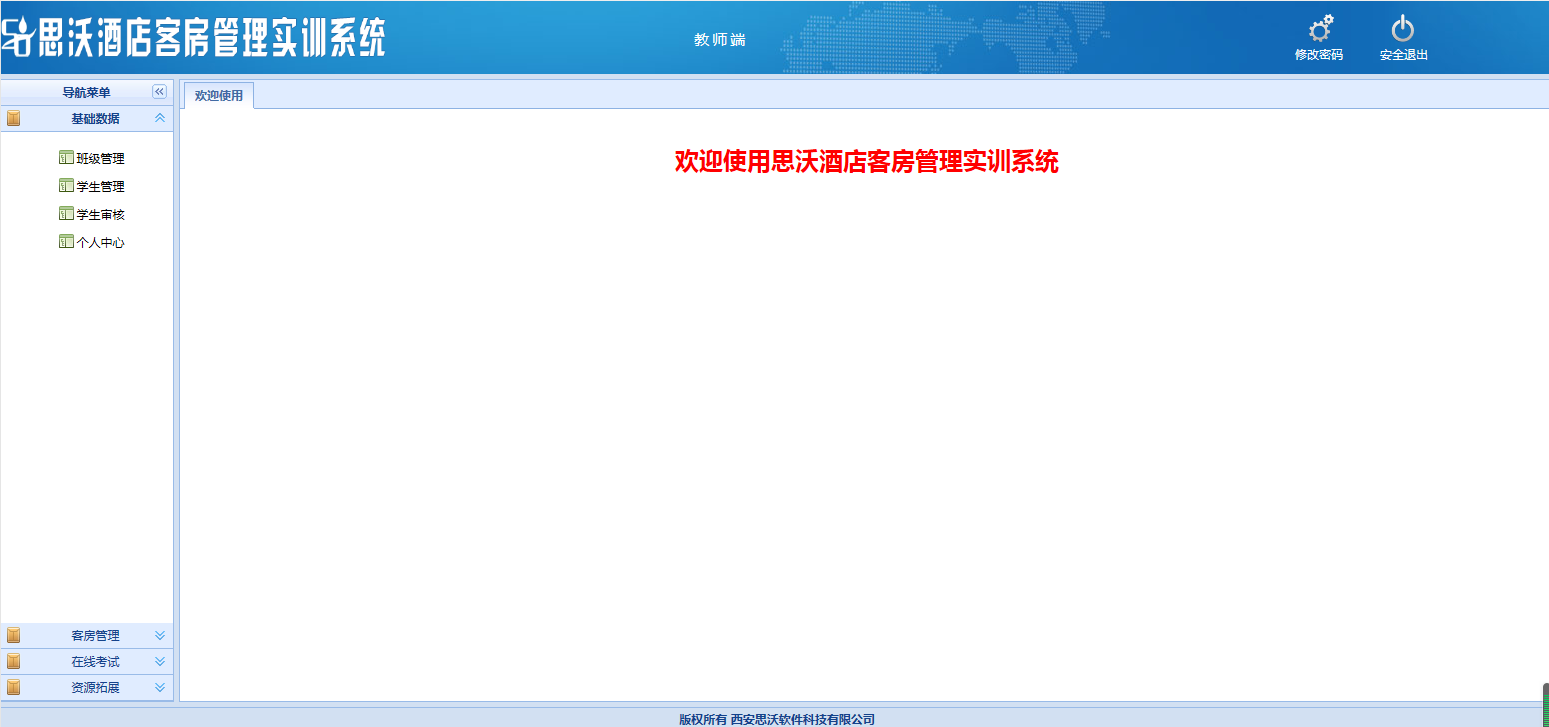 教師登陸界(jie)面:基礎(chu)數據、客(ke)房管理,在(zai)線考(kao)試,資源拓展每個大模塊下分(fen)別有相應(ying)的子(zi)模塊。