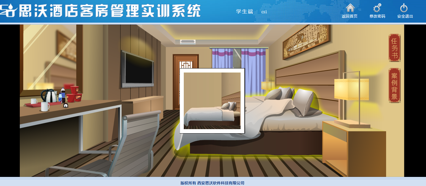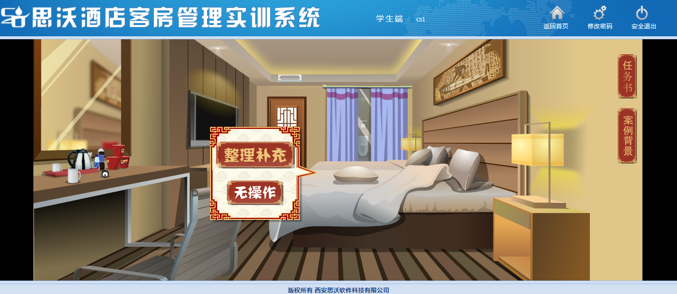 該教學(xue)軟件(jian)平臺(tai)模擬客房(fang)場景,學(xue)生(sheng)(sheng)通過場景互動進(jin)行(xing)模擬操(cao)作,包(bao)含任(ren)務書、案例背景等(deng),學(xue)生(sheng)(sheng)在(zai)操(cao)作過程中(zhong)可隨時查看進(jin)度。學(xue)生(sheng)(sheng)通過該教學(xue)軟件(jian)平臺(tai)的(de)虛擬場景中(zhong)可對(dui)床上(shang)用品、窗(chuang)簾、電器、桌椅、茶(cha)幾上(shang)的(de)消(xiao)費(fei)商(shang)品、洗漱臺(tai)、馬桶、浴室等(deng)進(jin)行(xing)整理操(cao)作。