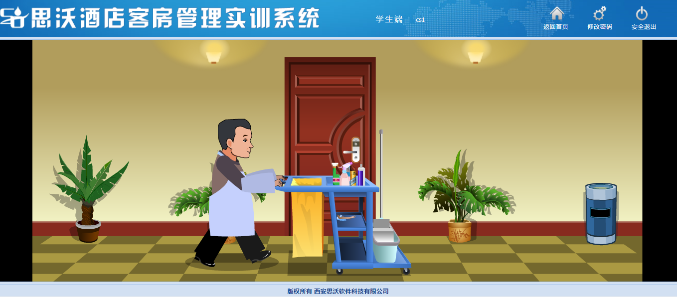 思沃酒(jiu)店客(ke)(ke)房(fang)(fang)管(guan)理(li)(li)模(mo)(mo)擬(ni)實訓(xun)系統(tong)以flash動畫模(mo)(mo)擬(ni)酒(jiu)店情景,學生進(jin)入進(jin)行模(mo)(mo)擬(ni)客(ke)(ke)房(fang)(fang)管(guan)理(li)(li)日常(chang)事務處(chu)理(li)(li),包括客(ke)(ke)房(fang)(fang)設計(ji)、引領(ling)入住(zhu)、客(ke)(ke)房(fang)(fang)查房(fang)(fang)、客(ke)(ke)房(fang)(fang)整理(li)(li)、布草間等類型實訓(xun)。