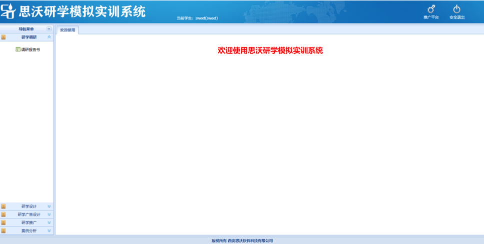 思沃研(yan)(yan)(yan)(yan)學(xue)(xue)(xue)模擬(ni)實訓(xun)系(xi)統分(fen)為管(guan)理員,教(jiao)師,學(xue)(xue)(xue)生(sheng)三種角色(se),功能包(bao)括(kuo)推廣(guang)(guang)(guang)平臺、首頁(ye),知識庫(ku),研(yan)(yan)(yan)(yan)學(xue)(xue)(xue)推廣(guang)(guang)(guang),圖文結(jie)合廣(guang)(guang)(guang)告(gao)(gao),媒體推送廣(guang)(guang)(guang)告(gao)(gao),研(yan)(yan)(yan)(yan)學(xue)(xue)(xue)調研(yan)(yan)(yan)(yan),研(yan)(yan)(yan)(yan)學(xue)(xue)(xue)設(she)計(ji)等。學(xue)(xue)(xue)生(sheng)通(tong)(tong)過(guo)模擬(ni)實訓(xun)體驗從研(yan)(yan)(yan)(yan)學(xue)(xue)(xue)內容調研(yan)(yan)(yan)(yan)、研(yan)(yan)(yan)(yan)學(xue)(xue)(xue)路線(xian)設(she)計(ji)、研(yan)(yan)(yan)(yan)學(xue)(xue)(xue)核心(xin)價值發掘、研(yan)(yan)(yan)(yan)學(xue)(xue)(xue)媒體網(wang)絡推廣(guang)(guang)(guang)等一系(xi)列工(gong)作內容。 研(yan)(yan)(yan)(yan)學(xue)(xue)(xue)軟件包(bao)含案例分(fen)析,點評,研(yan)(yan)(yan)(yan)學(xue)(xue)(xue)線(xian)路設(she)計(ji),團隊類(lei)(lei)型(xing)(xing),機型(xing)(xing),小交(jiao)通(tong)(tong)標(biao)準,出入境(jing)口岸,匯率(lv)維(wei)護,酒(jiu)店(dian)類(lei)(lei)型(xing)(xing),研(yan)(yan)(yan)(yan)學(xue)(xue)(xue)類(lei)(lei)型(xing)(xing)知識庫(ku)類(lei)(lei)型(xing)(xing),案例類(lei)(lei)型(xing)(xing),航(hang)空公司,線(xian)路區域,團隊等級,住宿標(biao)準,大交(jiao)通(tong)(tong)標(biao)準,門票(piao)標(biao)準,餐飲標(biao)準,導游證類(lei)(lei)別,酒(jiu)店(dian)等級,客(ke)戶行業分(fen)類(lei)(lei),客(ke)戶等級分(fen)類(lei)(lei),客(ke)戶關系(xi)深(shen)度,地接車(che)等級,客(ke)戶接受程度,國家維(wei)護,省份維(wei)護,城市(shi)維(wei)護,景點類(lei)(lei)型(xing)(xing),學(xue)(xue)(xue)生(sheng)可以進行系(xi)統的模擬(ni)學(xue)(xue)(xue)習(xi)。