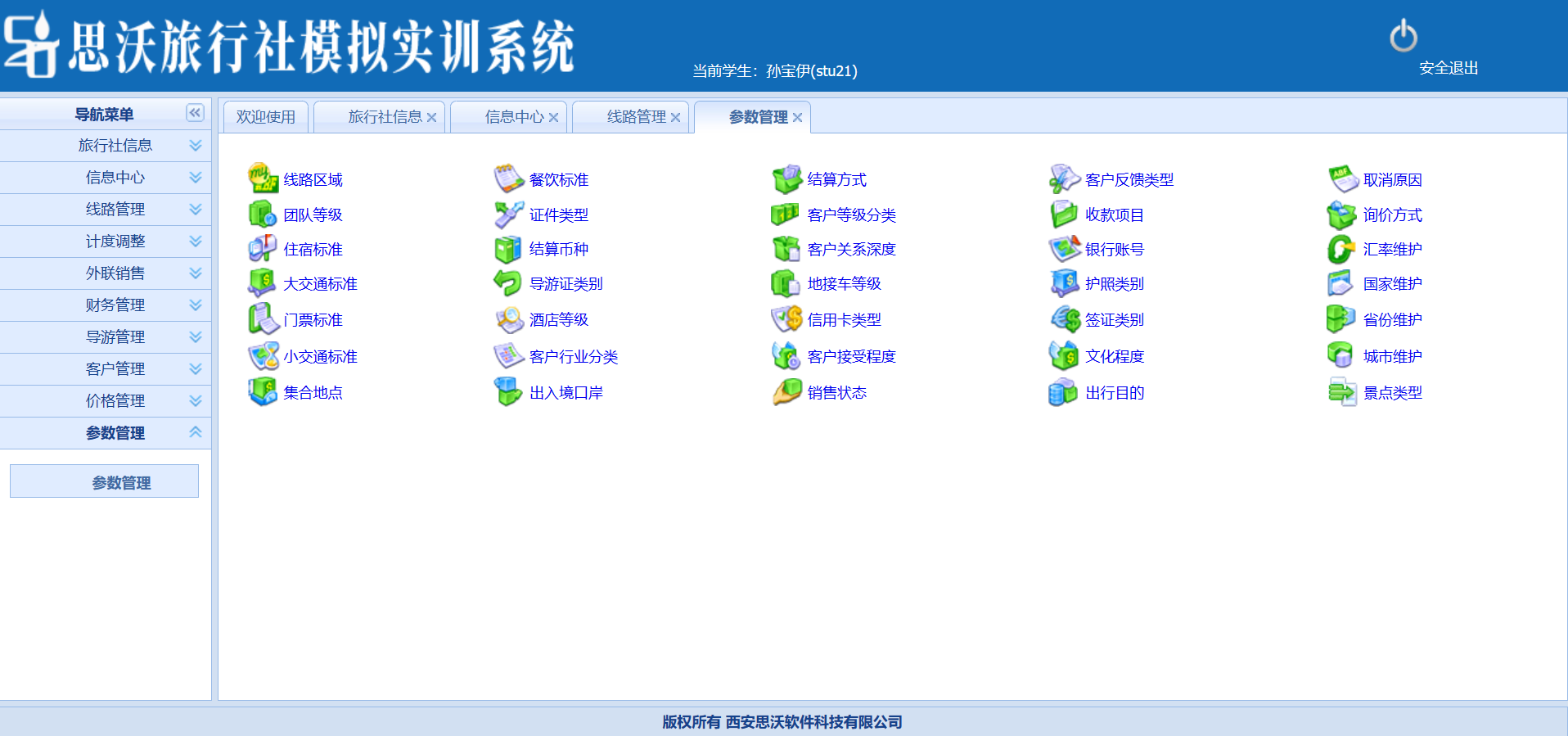 4、旅行(xing)(xing)(xing)(xing)社(she)經(jing)營管理,教(jiao)師(shi)端和(he)學(xue)生端旅行(xing)(xing)(xing)(xing)社(she)中(zhong)都有系(xi)(xi)(xi)統設置模(mo)(mo)塊(kuai),該(gai)模(mo)(mo)塊(kuai)包含了線路區域、餐飲標(biao)(biao)準(zhun)、結算(suan)方式、客(ke)(ke)戶(hu)反饋類(lei)(lei)型、取消原因、團(tuan)隊等(deng)(deng)級(ji)、證(zheng)件(jian)類(lei)(lei)型、客(ke)(ke)戶(hu)登記分類(lei)(lei)、收款(kuan)項目(mu)、詢價方式、住宿標(biao)(biao)準(zhun)、結算(suan)幣種、客(ke)(ke)戶(hu)關系(xi)(xi)(xi)深度(du)(du)、銀行(xing)(xing)(xing)(xing)賬號、匯率(lv)維(wei)護、大交通標(biao)(biao)準(zhun)、導游證(zheng)類(lei)(lei)別、地接車等(deng)(deng)級(ji)、護照(zhao)類(lei)(lei)別、國家維(wei)護、門票標(biao)(biao)準(zhun)、酒店(dian)等(deng)(deng)級(ji)、信用卡(ka)類(lei)(lei)型、簽證(zheng)類(lei)(lei)別、省份維(wei)護、小交通標(biao)(biao)準(zhun)、客(ke)(ke)戶(hu)行(xing)(xing)(xing)(xing)業分類(lei)(lei)、客(ke)(ke)戶(hu)接受程(cheng)度(du)(du)、文化程(cheng)度(du)(du)、城市維(wei)護、集(ji)合地點、出入境口岸(an)、銷售狀態、出行(xing)(xing)(xing)(xing)目(mu)的和(he)景點類(lei)(lei)型等(deng)(deng),系(xi)(xi)(xi)統中(zhong)已經(jing)添加了較多的所(suo)有旅行(xing)(xing)(xing)(xing)社(she)管理元素,教(jiao)師(shi)也(ye)可(ke)自(zi)己添加、修改、刪除。