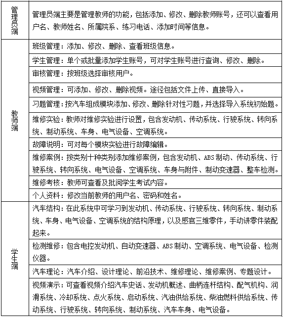 軟件分(fen)為汽(qi)(qi)(qi)車(che)(che)(che)(che)結(jie)構(gou)(gou)(gou)教學(xue)和(he)(he)考核兩部(bu)(bu)(bu)分(fen)。汽(qi)(qi)(qi)車(che)(che)(che)(che)結(jie)構(gou)(gou)(gou)教學(xue)通(tong)過(guo)(guo)豐富的(de)圖片、動(dong)畫等(deng)多種表現方式詳細介(jie)紹汽(qi)(qi)(qi)車(che)(che)(che)(che)的(de)各個(ge)(ge)組成部(bu)(bu)(bu)分(fen)。介(jie)紹每(mei)個(ge)(ge)結(jie)構(gou)(gou)(gou)的(de)作(zuo)用原理、分(fen)類(lei)、特性、裝(zhuang)(zhuang)配維修。通(tong)過(guo)(guo)這兩個(ge)(ge)部(bu)(bu)(bu)分(fen)讓學(xue)生更(geng)好的(de)掌握汽(qi)(qi)(qi)車(che)(che)(che)(che)結(jie)構(gou)(gou)(gou)設(she)(she)計的(de)相關知(zhi)識。軟件包(bao)含五大模(mo)塊(kuai):發(fa)動(dong)機(ji)(ji)、汽(qi)(qi)(qi)車(che)(che)(che)(che)底盤、車(che)(che)(che)(che)身、電氣設(she)(she)備和(he)(he)汽(qi)(qi)(qi)車(che)(che)(che)(che)檢(jian)測線(xian)教學(xue)。其中發(fa)動(dong)機(ji)(ji)部(bu)(bu)(bu)分(fen)分(fen)為汽(qi)(qi)(qi)油機(ji)(ji)和(he)(he)柴油機(ji)(ji)。在汽(qi)(qi)(qi)車(che)(che)(che)(che)車(che)(che)(che)(che)身模(mo)塊(kuai)從傳(chuan)動(dong)系、行(xing)使系、轉(zhuan)向系和(he)(he)制(zhi)動(dong)系四個(ge)(ge)方面進行(xing)介(jie)紹,重點介(jie)紹汽(qi)(qi)(qi)車(che)(che)(che)(che)自動(dong)變速器(qi)、汽(qi)(qi)(qi)車(che)(che)(che)(che)的(de)動(dong)力轉(zhuan)向系統和(he)(he)汽(qi)(qi)(qi)車(che)(che)(che)(che)防抱死(si)系統(ABS)等(deng)。在電器(qi)設(she)(she)備方面著重于(yu)汽(qi)(qi)(qi)車(che)(che)(che)(che)空調設(she)(she)備的(de)作(zuo)用原理安裝(zhuang)(zhuang)和(he)(he)維護(hu)。通(tong)過(guo)(guo)讓學(xue)生來觀(guan)看(kan)汽(qi)(qi)(qi)車(che)(che)(che)(che)在檢(jian)測線(xian)上進行(xing)檢(jian)測的(de)整個(ge)(ge)流(liu)程(cheng)和(he)(he)模(mo)擬控制(zhi),讓學(xue)生掌握檢(jian)測線(xian)的(de)工作(zuo)流(liu)程(cheng)。